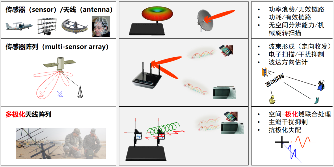 传感器阵列(multi-sensor array)、波束形成(定向收发)、电子扫描/干扰抑制、波达方向估计、多极化天线阵列-空间-极化域联合处理、主瓣干扰抑制、抗极化失配。