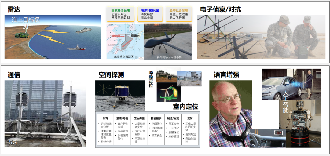 雷达探测、电子侦察/对抗、通信、空间探测、室内定位、语言增强。