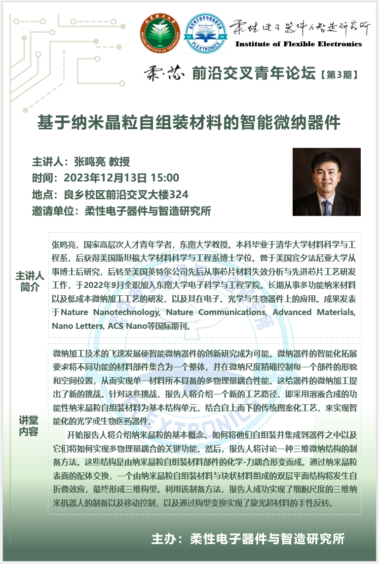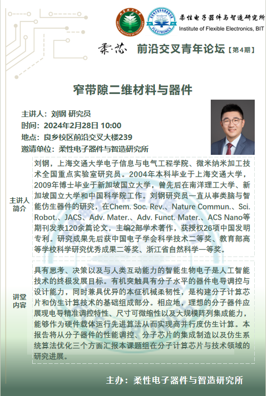 柔性电子器件与智造研究所 (Institute of Flexible Electronics, BIT)由国家杰出青年基金获得者沈国震教授组建,依托必威西汉姆联官网必威西汉姆联,聚焦后摩尔时代微电子器件与集成电路的革命性发展方向,面向国家重大需求和国际前沿,基于柔性电子可拉伸、弯曲、折叠的形态特点,可转移、印刷的加工工艺,曲面共型、动态跟随的新应用拓展,从本征柔性低维半导体合成、工艺开发、设备研制、系统研制等方面开展系统的前沿基础与应用研究,主要方向包括:柔性光电器件与视觉芯片,柔性感知与智能机器人,仿生传感器与健康医疗,柔性多功能集成系统的设计与应用。研究所致力于打造一流的柔性电子专精特色研究平台,多学科交叉融合的公共实验平台,新型电子器件与系统集成高水平研究中心,集成电路与电子学科人才高地,未来颠覆性高精尖国防应用装备技术的研究中心,在引领该领域的学术技术前沿同时,着力培养具有精湛专业能力、思辨精神和家国情怀的新一代人才。