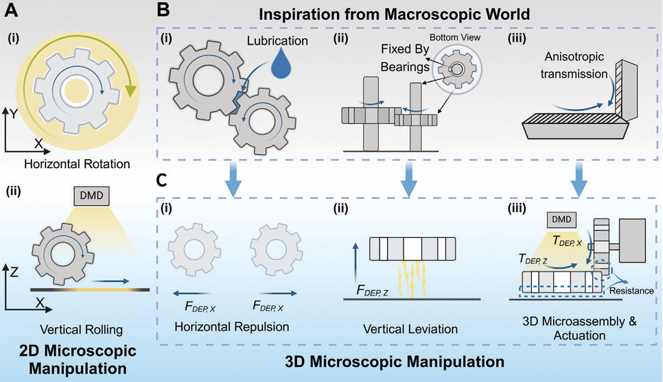 图3. 基于OET的微齿轮系统组装与驱动A) 2PP制备的机械支撑结构SEM图像。B)机械支撑的俯视显微镜图像。C) 直立微齿轮与支撑结构的组装过程示意图及实验图像。D) 组装后微齿轮与支撑的互连结构。E) 三维跨平面微齿轮组的运行示意图及实验图像。