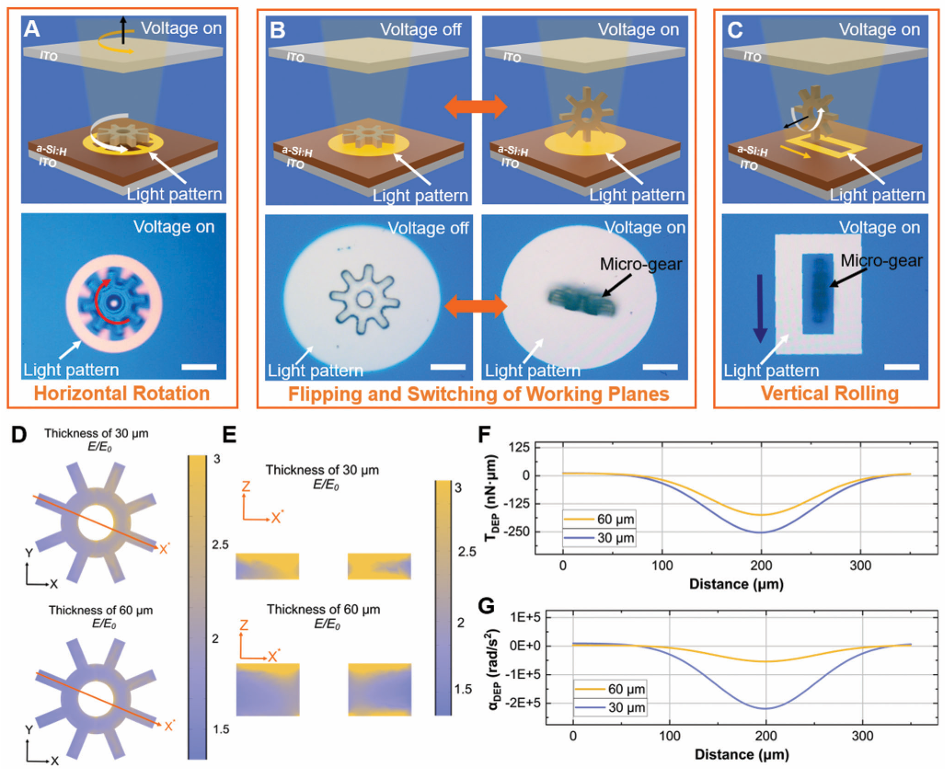 图2. 微齿轮的翻转行为A) 微齿轮在水平面旋转的示意图及显微镜图像。B) 电压关闭时平躺的微齿轮(左),电压开启后通过圆形光图案推动翻转至直立状态。C) 直立微齿轮被空心矩形光图案推动并在垂直平面滚动。D) 30 μm和60 μm厚微齿轮在XY平面的相对电场分布模拟。E) 30 μm和60 μm厚微齿轮在XZ平面的相对电场分布模拟。F) 不同位置下微齿轮的介电泳翻转扭矩计算结果。G) 不同位置下微齿轮的翻转角加速度计算结果。