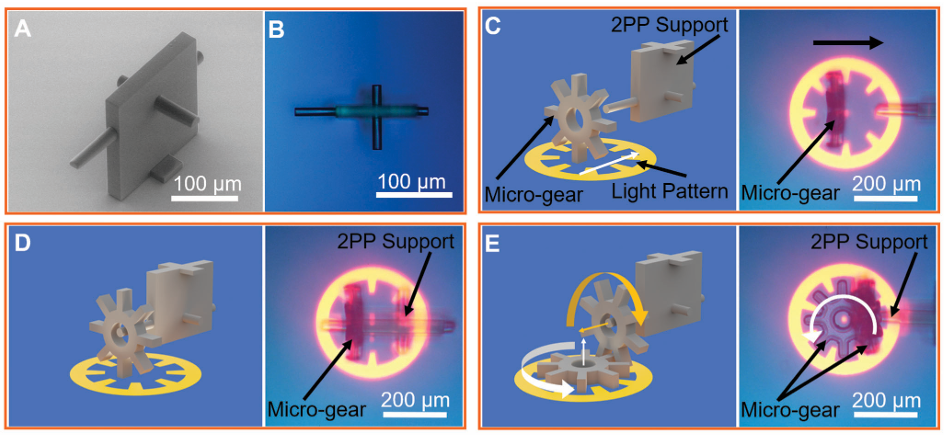 跨维度运动传递:从2D到3D为了构建稳定的三维微齿轮系统,团队采用双光子聚合(2PP)激光加工技术,制造了微型支撑结构,使直立齿轮能够稳定旋转。实验中,水平旋转的齿轮通过齿轮啮合成功驱动了直立齿轮,实现了跨平面运动传递,这一突破为未来搭建复杂三维传动模块提供了重要基础。