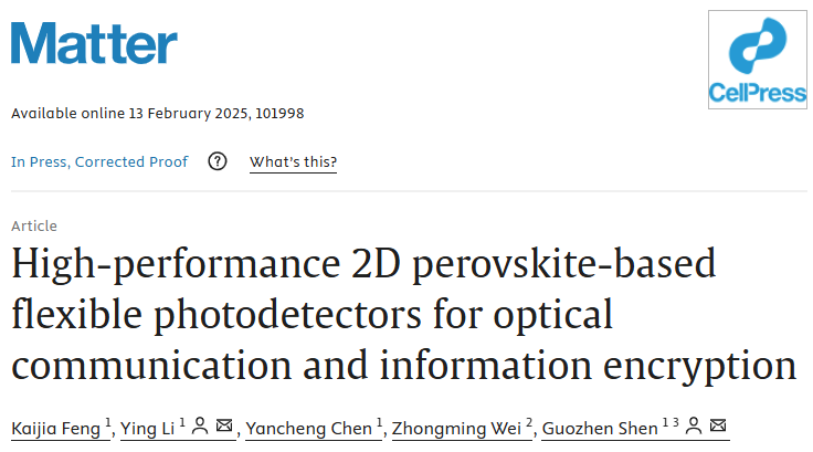 论文详情:Kaijia Feng, Ying Li*, Yancheng Chen, Zhongming Wei and Guozhen Shen*, High-performance 2D perovskite-based flexible photodetectors for optical communication and information encryption.