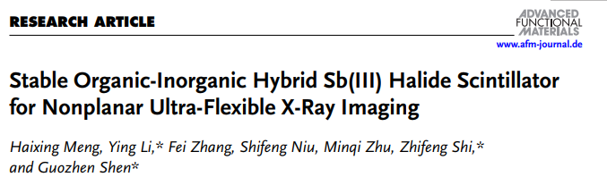 论文详情:Haixing Meng, Ying Li*, Fei Zhang, ShifengNiu, Minqi Zhu, Zhifeng Shi* and Guozhen Shen*,Stable Organic-Inorganic Hybrid Sb(Ⅲ) Halide Scintillator for Nonplanar Ultra-Flexible X-Ray Imaging.