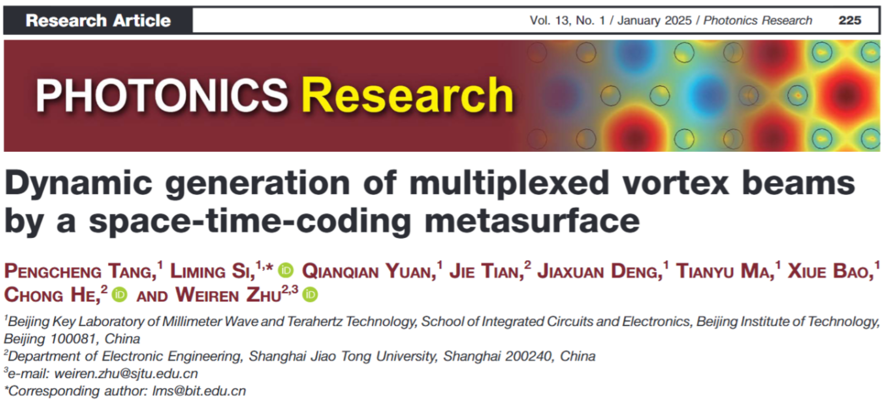 文章信息:Pengcheng Tang, Liming Si*, Qianqian Yuan, Jie Tian, Jiaxuan Deng, Tianyu Ma, Xiue Bao, Chong He, Weiren Zhu, “Dynamic generation of multiplexed vortex beams by a space-time-coding metasurface,” Photonics Research, Vol. 13, No 1, pp: 225-234, 2025.