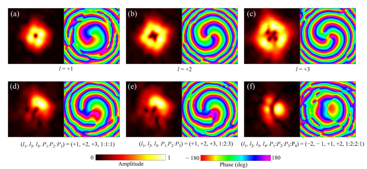 可编程超表面通常只能实现对相位等单一电磁参量的离散控制,而如何动态生成具有任意定制模式组成和功率分配的复用涡旋波仍未得到有效解决。为此,课题组提出了一种智能电磁控制理论与技术,能够在不改变物理结构或输入激励的情况下,动态调节生成的复用涡旋波束的轨道角动量(OAM)模式组成和功率分配。时空编码涡旋波超表面原型样机在微波频段得到实验验证,如图2所示。实验结果表明,由该超表面生成的OAM模式(+1/+2/+3模式)的涡旋波束,其模式纯度均高于93%。同时,该超表面成功实现了定制功率比为1:1:1的(+1, +2, +3)模式、功率比为1:2:3的(+1, +2, +3)模式,以及功率比为1:2:2:1的(-2, -1, +1, +2)模式复用涡旋波束,验证了超表面在生成复用涡旋波束方面的优异性能,如图3-5所示。该方法可有效推广至太赫兹、红外和光学频段,并在多模态复用通信、雷达和传感系统中展现出较大的应用潜力,有望推动相关领域的技术创新和发展。