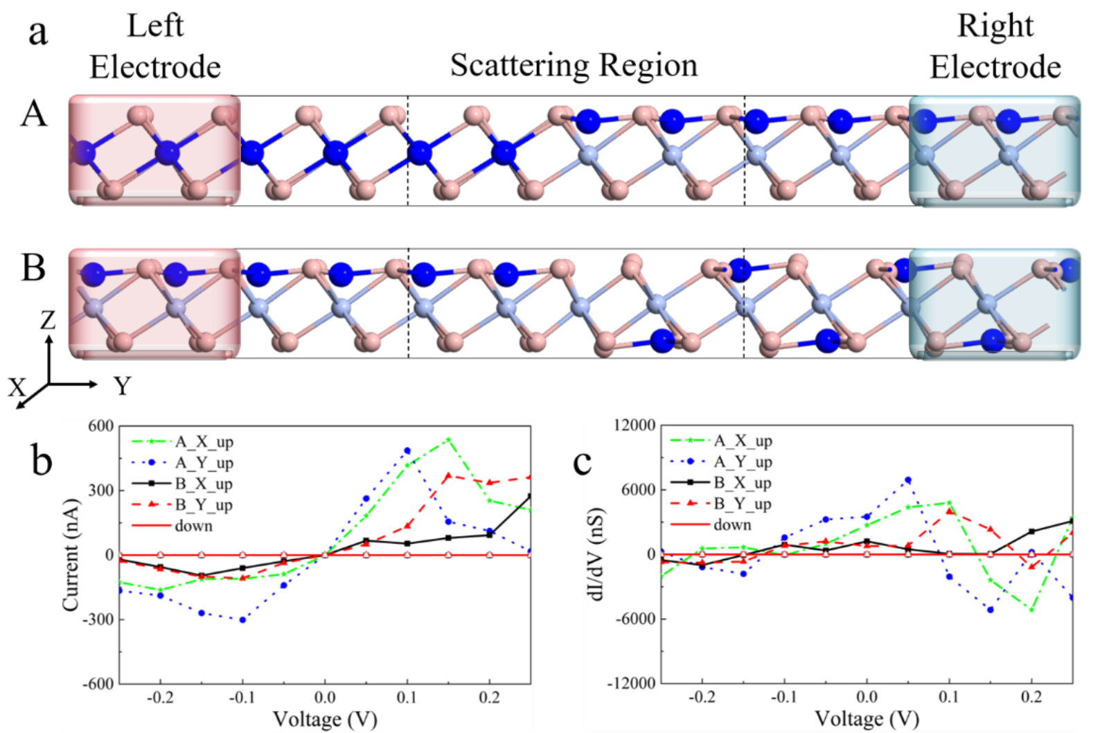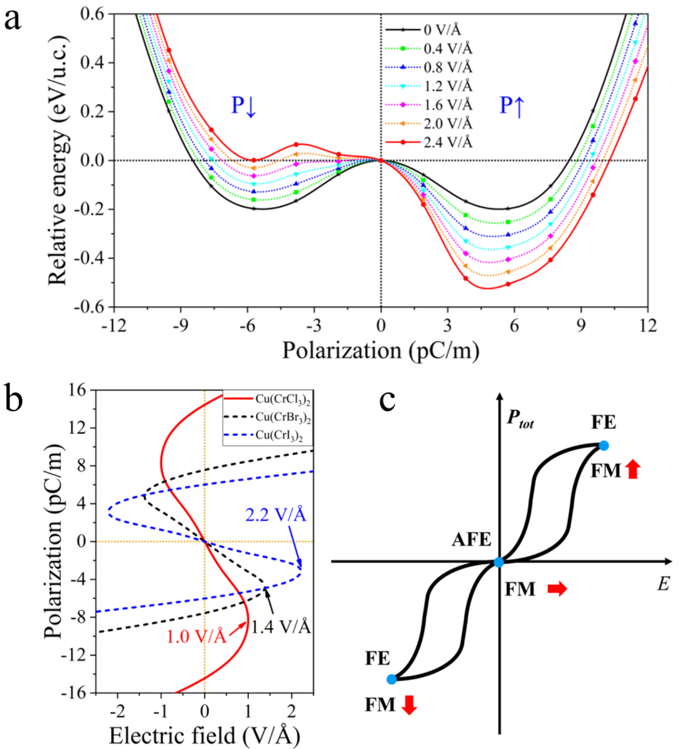 长期以来,人们一直在寻找具有本征多铁性的二维材料,以实现纳米电子器件中磁电耦合的应用。本工作中作者利用过渡金属原子修饰单层三卤化铬实现了单层稳定的Ⅰ型多铁性,并且其电极化为面外铁电极化,这有利于外场对其铁电性的调控。面外铁电极化表现出较强的原子选择性,作者发现了84种基于过渡金属的单层多铁材料,其中有12种具有面外铁电或反铁电极化。通过群论分析揭示了这种现象依赖于p-d耦合和晶体场劈裂。Cu修饰增强了三卤化物的本征铁磁性,并且提高了铁磁转变温度。通过计算不同铁电结构(反铁电和铁电)的电极化,作者研究了该系统中的磁电耦合效应。在这些体系中作者获得了铁电相和反铁电相,为磁性材料的外场调控、能量存储和转换应用提供了新机遇。此外,作者利用非平衡格林函数方法,计算了双电极Cu(CrBr3)2器件的输运性质,结果表明,Cu(CrBr3)2器件具有出色的自旋过滤特性和低偏压负微分电阻(Negative differential resistance, NDR)效应,具有低功耗的开关响应特性。作者的研究不仅深化了对二维多铁性材料的认识,预测了多种具有面外铁电极化的新材料,并揭示了其铁电性和铁磁性增强机制,在纳米电子和自旋电子器件领域具有广阔的应用前景。