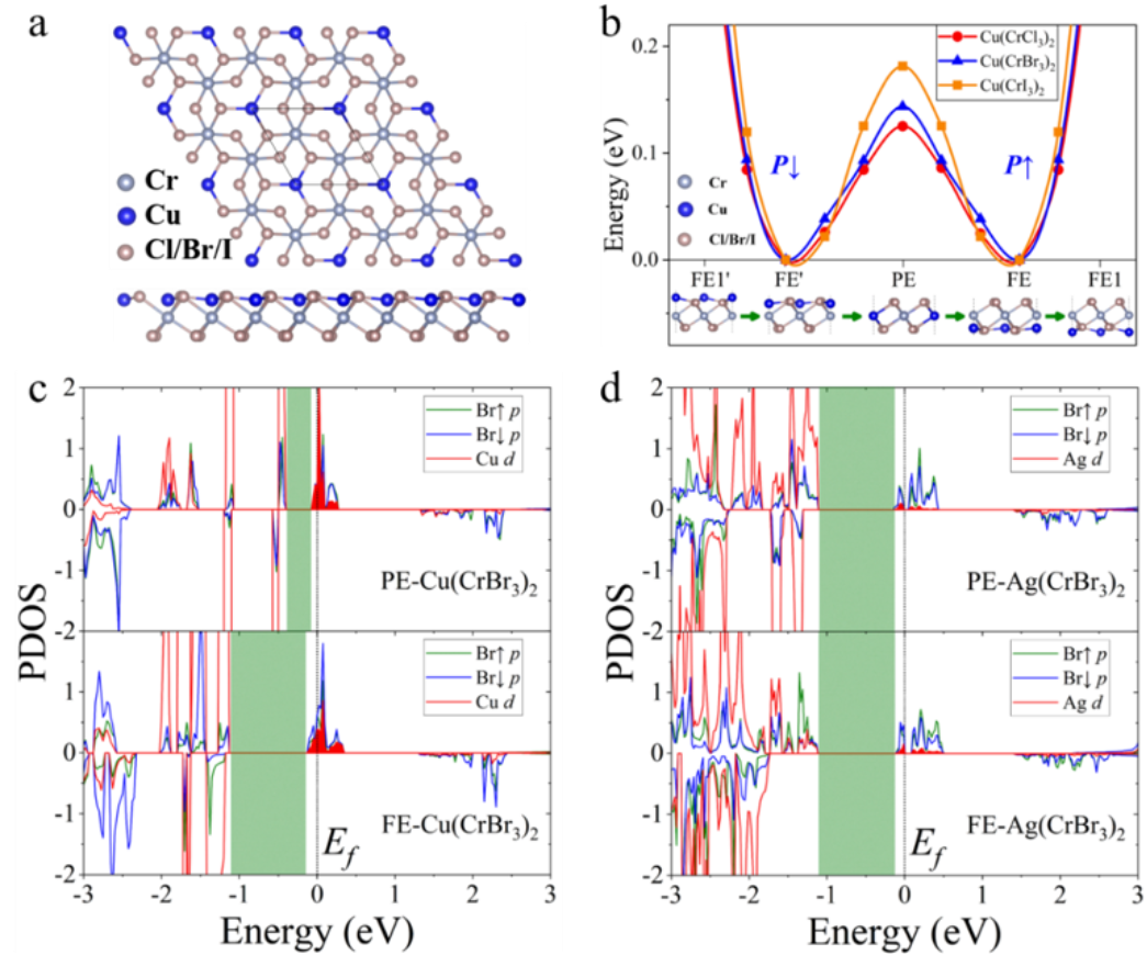 图1单层Cu(CrX3)2原子结构和投影态密度图