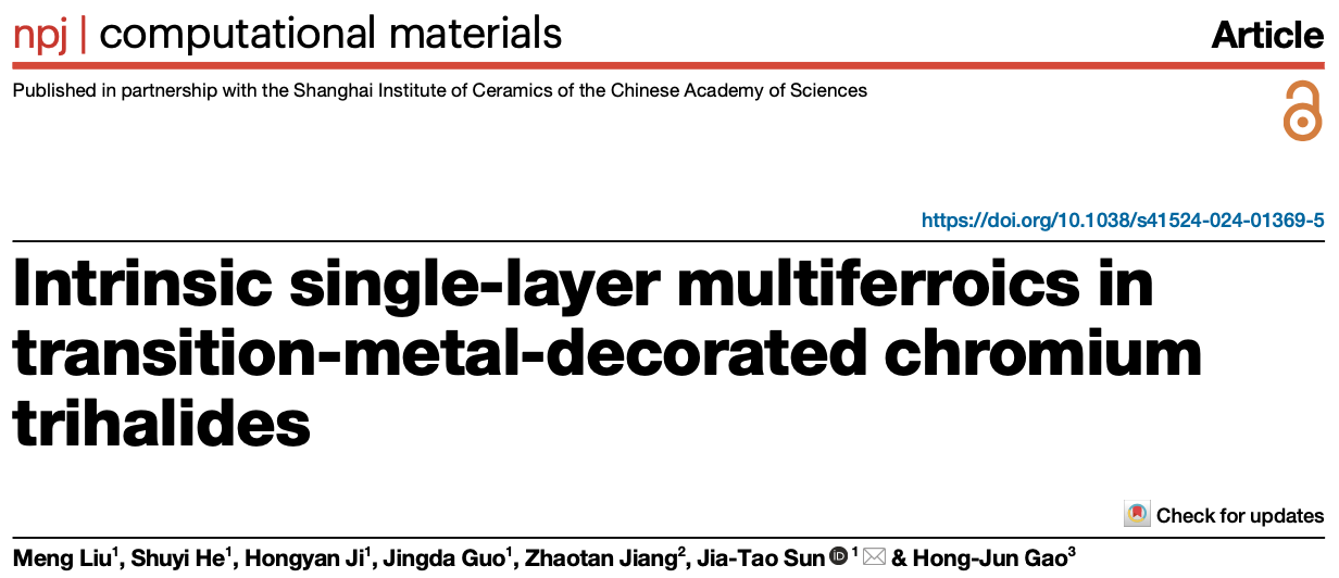 Meng Liu, Shuyi He, Hongyan Ji, Jingda Guo,Zhaotan Jiang, and Jia-Tao Sun*, Hong-Jun Gao. Intrinsic single-layer multiferroics in transition-metal-decorated chromium trihalides. npj Computational Materials 10, 180 (2024)