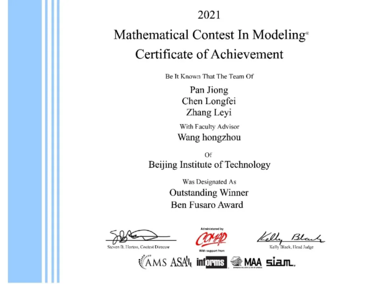 “学而时习之,不亦说乎。”知识付诸实践,才会精彩灵动。2021年2月,时值美国大学生数学建模竞赛,不期疫情又袭,潘炯率队线上技术攻关,奋战四昼夜,一举摘得特等奖(Outstanding Winner)和Ben Fusaro Award单项冠名奖(该奖以赛事创立者Ben Fusaro命名,通常授予最具创意的作品)。为此,国家工信部官网作了专门报道。在比赛中,作为队长的他主要负责建模工作。他利用所学数理方程的知识建立模型化方程,对不同生态系统中凋落物和木屑纤维通过真菌活动的分解过程进行了综合分析,为理论生物学研究提供了很有创意的思路。