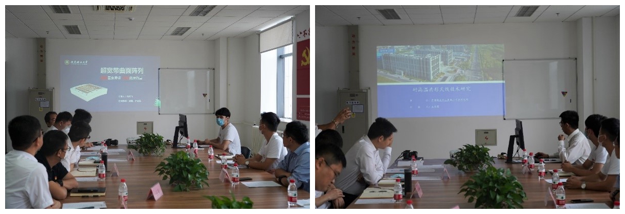 研究生微波第一党支部的甄鹏飞博士进行了题为《低剖面紧耦合超宽带阵列天线》的学术报告,由十室党支部的王金灏同志进行了题为《耐高温共形天线技术》的学术报告。