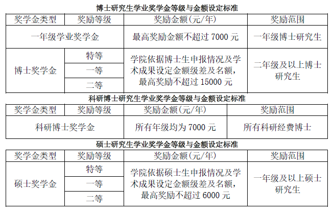 1.博士研究生奖励标准:学校根据核定人数,按每年人均不低于7000元下发各单位分配额度,各年级奖励等级与标准由学院制定。原则上分三个等级,并设定金额级差。其中,一年级博士研究生学业奖学金不分等级,三年级及以上博士研究生设立特等奖学金,奖励金额不低于每生每年15000元,奖励比例不低于参评人数的10%。