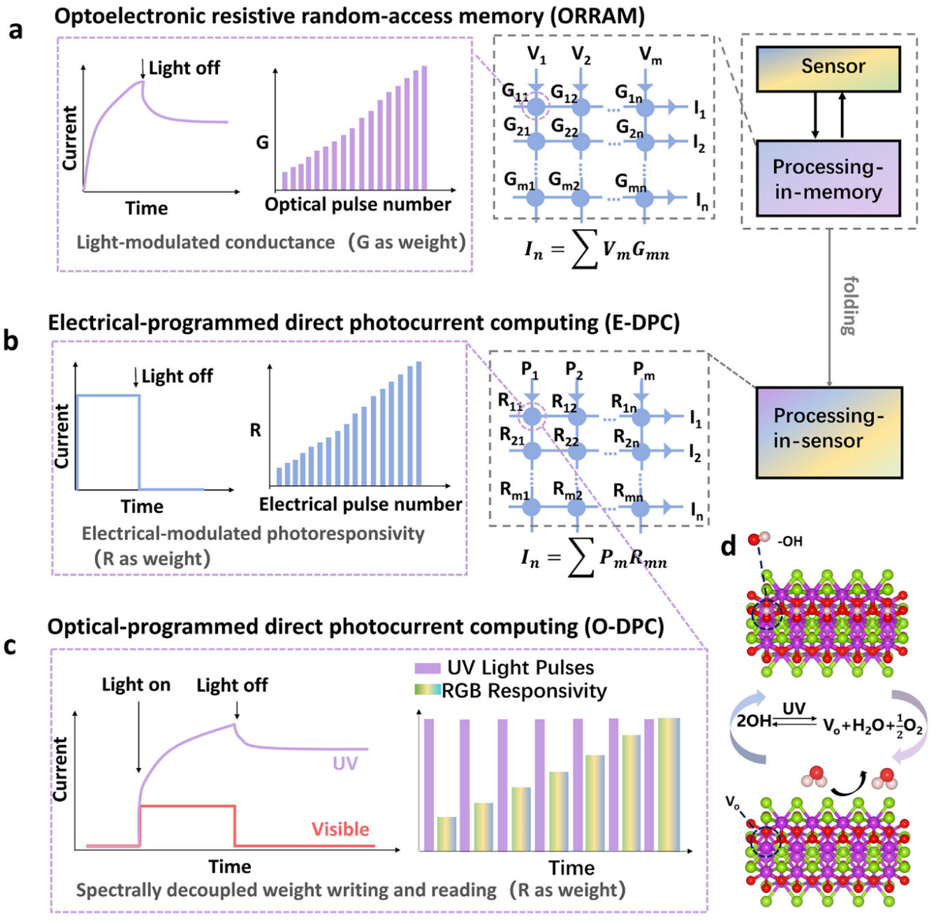 该研究提出了基于BOS材料平台的光可编程直接光电流计算器件,通过紫外光实现的可逆表面羟基解离重新配置氧空位动力学,从而实现光谱解耦的权重编程和光电流计算。作者通过实验发现,紫外光照射下,BOS材料表面的羟基发生解离,生成氧空位,这些氧空位作为有效的空穴捕获中心,导致持久光导性(PPC)的出现。该PPC效应不仅增强了材料在可见光范围内的光响应性,还为DPC提供了一个非易失性的突触权重。