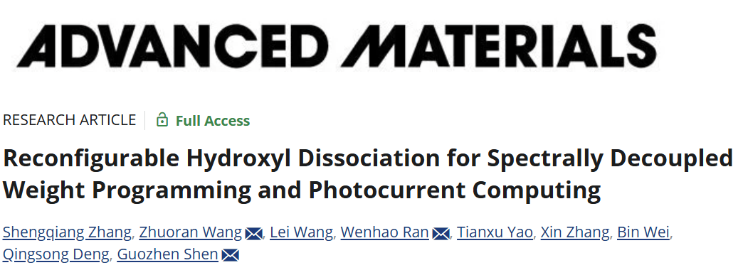 近日,必威西汉姆联官网必威西汉姆联柔性电子器件与智造研究所沈国震团队在传感器内运算器件领域取得进展,相关成果以“Reconfigurable Hydroxyl Dissociation for Spectrally Decoupled Weight Programming and Photocurrent Computing”为题发表于期刊《Advanced Materials》。该研究提出了一种新型传感器内运算器件模型,利用紫外光下Bi2O2Se(BOS)可重构羟基解离行为,实现不同波长下的响应度权重编程与光电流计算过程的解耦,解决了传统光电流计算器件光权重写入和计算过程中干扰问题,为全光编程与计算的边缘视觉器件提供新思路。