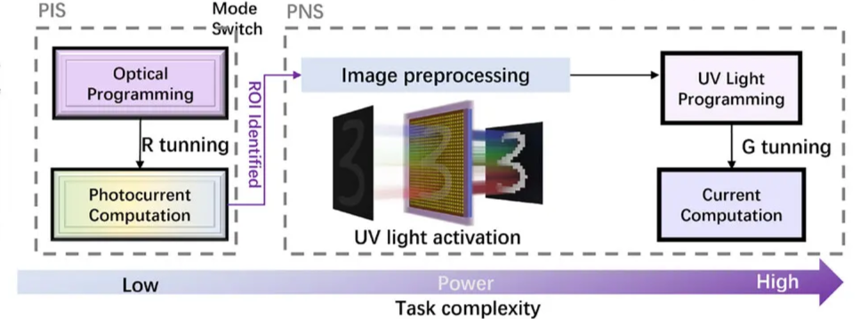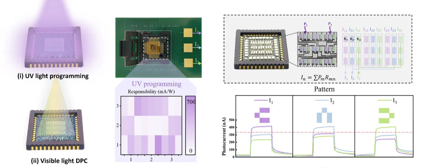 然而,当前DPC器件的关键限制是它们完全依赖于电信号进行权重编程,这需要特定的外围电路,且读出光电流可能会干扰存储的权重值。相比之下,在DPC器件中实现光权重编程提供了一个变革性的机会,其可提供速度和带宽的固有优势,而主要挑战是解决光权重写入和基于成像的计算过程之间的基本干扰。