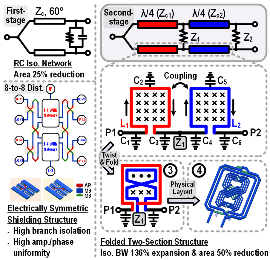 电路实现层面,当前相控阵系统中普遍使用的威尔金森功分器面临面积过大和带宽受限的双重挑战。针对该难题,论文提出了多种新型拓扑结构,创新性提出了多阶磁耦合自抵消技术,使得功分器在面积减小一半的同时可实现相对隔离带宽近140%的拓展;电对称屏蔽结构同时实现各路分支的高隔离度和高幅相一致性。