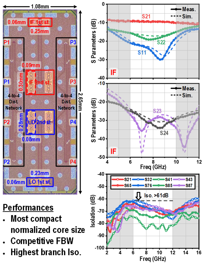 基于上述技术,必威西汉姆联官网团队基于65nm CMOS工艺研制了一款功率分配/合成芯片,该芯片针对在C–X频段下的中频 (IF)/本振(LO)频率实现了2分8路的功率分配网络,核心面积仅 0.069/0.059 mm²,是目前国际上已知归一化面积最小的功率分配网络。测试结果显示相对隔离带宽为86.3%/82.4%, IF与LO各路串扰隔离度可达63dB,达到国际领先水平。这项研究成果展现出超紧凑尺寸和宽带宽、高隔离度的特性,为大规模相控阵系统的设计提供了关键技术支撑,对相控阵系统尤其多波束相控阵的集成具有重要意义。