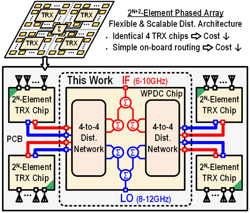 在 5G/6G 通信及雷达领域的前沿应用中,相控阵技术正展现出巨大潜力。随着大规模相控阵系统对芯片集成密度与性能指标的进阶需求持续提升,功率分配/合成网络正面临来自物理尺寸优化、拓扑复杂度管控等多维度的技术挑战。针对当前大规模相控阵集成分配网络复杂难题,论文提出了一种低成本可扩展架构使得2N元相控阵可快速拓展至2N+2阵,同时该方案可极大降低芯片与PCB加工成本。